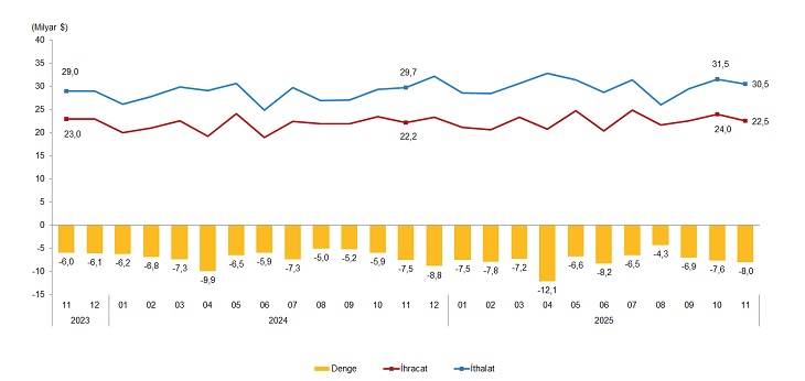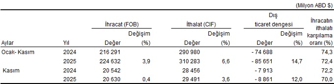 Ocak-Kasım döneminde dış ticaret açığı %12,6 artarak 73 milyar 421 milyon dolardan, 82 milyar 674 milyon dolara yükseldi. İhracatın ithalatı karşılama oranı 2024 Ocak-Kasım döneminde %76,5 iken, 2025 yılının aynı döneminde %74,9’a geriledi.