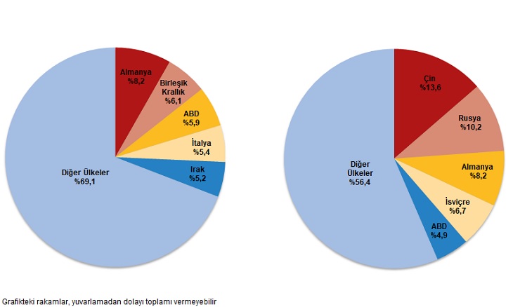 İthalatta Çin ilk sırayı aldı. Kasım ayında Çin’den yapılan ithalat 4 milyar 153 milyon dolar olurken, bu ülkeyi sırasıyla; 3 milyar 128 milyon dolar ile Rusya Federasyonu, 2 milyar 491 milyon dolar ile Almanya, 2 milyar 32 milyon dolar ile İsviçre, 1 milyar 488 milyon dolar ile ABD izledi. İlk 5 ülkeden yapılan ithalat, toplam ithalatın %43,6’sını oluşturdu.